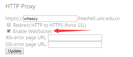 Freeshell HTTP Proxy 支持 WebSocket 的反向代理了,只需在控制面板中启用 WebSocket,如下图所示: